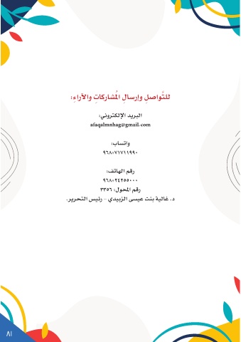 : ِ ءارلآاو تاكراشُلما لاسرإو لصاوَتلل ِ ِ ِ :ينورتكللإا ديربلا afaqalmnhag@gmail.com :باستاو 9٦8+71711990 :فتاهلا مقر 9٦8+24255000 ٣٣5٦ :لولمحا مقر .ريرحتلا سيئر - يديبزلا ىسيع تنب ةيلاغ .د 81 81