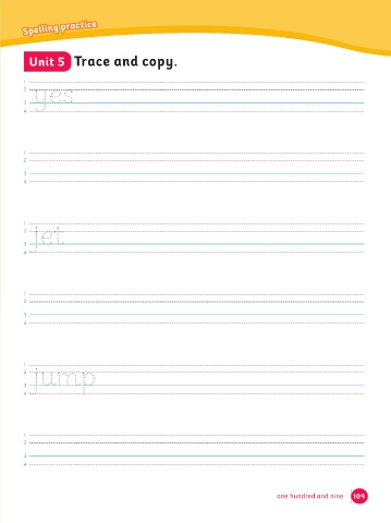 Lesson 1 practice Spelling Lesson 1 Unit 5 Trace and copy. 1 3 yes 2 4 1 2 3 4 1 3 jet 2 4 1 2 3 4 1 3 jump 2 4 1 2 3 4 one hundred and nine 109