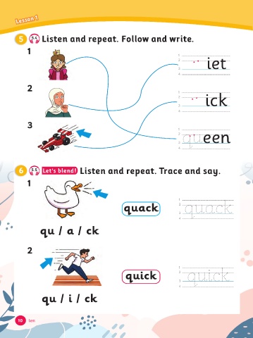 Lesson 1 5 5.4 Listen and repeat. Follow and write. 1 1 iet 2 3 4 2 1 ic 2 3 4 3 1 queen 2 3 4 6 5.5 Let's blend! Listen and repeat. Trace and say. 1 1 quac 2 quac 3 4 qu / a / c 2 1 quic 2 quic 3 4 qu / i / c 10 ten