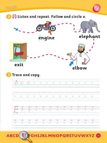 Lesson 2 Lesson 1 5 5 Lesson 1 3 5.11 Listen and repeat. Follow and circle e. engine elephant exit elbow 4 Trace and copy. 1 3e e e 2 1 4 1 2 3 4 1 3 1 3E E E 2 4 2 4 1 2 3 4 E G ABCD FGHIJKLMNOPQRSTUVWXYZ 13 D ee n thirt thirteen