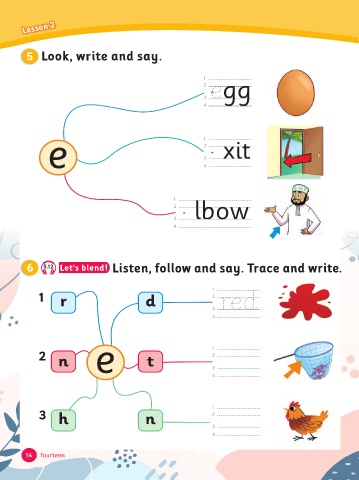 Lesson 2 5 Look, write and say. 1 egg 2 3 4 e 1 2 3 xit 4 1 lbow 2 3 4 6 5.12 Let's blend! Listen, follow and say. Trace and write. 1 1 r d 2 red 3 4 e t 2 1 2 n 3 4 1 3 h n 2 3 4 14 fourteen