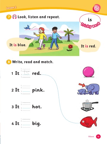 Lesson 2 Lesson 1 5 Lesson 1 7 5.13 Look, listen and repeat. is Tricky wor d It is blue. It is red. 8 Write, read and match. 1 2 1 It is red. 3 4 1 2 pin . 2 It 3 4 1 2 hot. 3 It 3 4 1 2 big. 4 It 3 4 fifteen 15