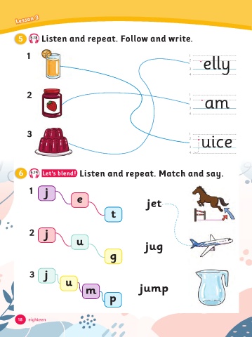 Lesson 3 5 5.18 Listen and repeat. Follow and write. 1 1 2 elly 3 4 2 1 2 am 3 4 3 1 2 juice 3 4 6 5.19 Let's blend! Listen and repeat. Match and say. 1 j e jet t 2 j u jug g 3 j u m jump p 18 eighteen