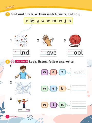 Lesson 1 5 Find and circle w. Then match, write and say. v w y u w m w j n 1 2 3 1 1 1 ind ave ool 2 2 2 3 3 3 4 4 4 6 6.5 Let's blend! Look, listen, follow and write. 1 1 w e t 2 wet 3 4 2 1 w e b 2 3 4 3 1 w i n 2 3 4 34 thirty-four
