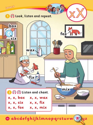 Lesson 3 x X 1 6.13 Look, listen and repeat. box ox six wax ix mix 2 6.14 6.15 Listen and chant. x, x, box x, x, wax x, x, six x, x, ix x, x, ox x, x, mix x abcde ghij lmnopqrstuvw yz 40