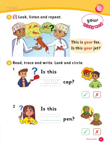 Lesson 4 Lesson 1 6 6 Lesson 1 5 6.22 Look, listen and repeat. your Tricky wor d This is your fox. Is this your jet? 6 Read, trace and write. Look and circle. 1 Is this 1 2 your cap? 3 4 2 Is this 1 2 pen? 3 4 forty-seven 47
