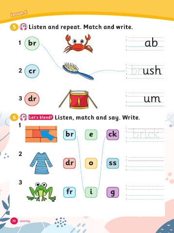 Lesson 4 5 7.29 Listen and repeat. Match and write. 1 1 br 2 ab 3 4 1 2 cr 2 brush 3 4 1 3 dr 2 um 3 4 6 7.30 Let's blend! Listen, match and say. Write. 1 1 br e c 2 bric 3 4 2 1 dr o ss 2 3 4 3 1 r i g 2 3 4 70 seventy
