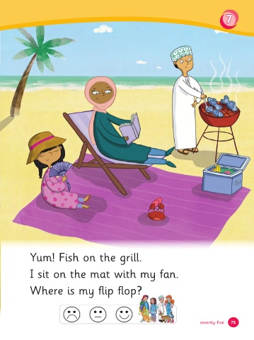 7 Yum! Fish on the grill. I sit on the mat with my an. Where is my lip lop? 75 seventy-five 75
