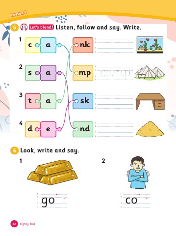Lesson 1 5 8.5 Let's blend! Listen, follow and say. Write. 1 1 c a n 2 3 4 2 1 s a mp 2 camp 3 4 3 1 t a s 2 3 4 4 1 d e nd 2 3 4 6 Look, write and say. 1 2 1 1 go co 2 2 3 3 4 4 82 eighty-two