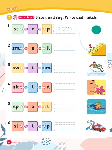 Lesson 2 5 8.11 Let's blend! Listen and say. Write and match. 1 1 2 st e p step 3 4 2 1 2 sm e ll 3 4 3 1 2 sw i m 3 4 4 1 2 s i d 3 4 5 1 2 sp o t 3 4 6 1 2 sl i p 3 4 86 eighty-six