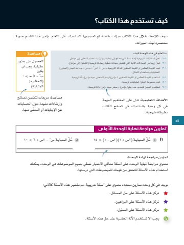 xiiللحصول على جذور حقيقية، يجب أن يكون 2 - 4أجـ < 0ب)الحظ رمز المتباينة(مساعدةسوف تالحظ خالل هذا الكتاب ميزات خاصة تم تصميمها لتساعدك على التعلم. يؤمن هذا القسم صورة مختصرة لهذه الميزات.األهداف التعليمية: تدل على المفاهيم المهمة في كل وحدة وتساعدك في تصفح الكتاب بطريقة منهجية.131-1ّ حل المعادالت التربيعية بالتحليل إلى عواملتمارين ١-١1ّ )حل ّ كل معادلة من المعادالت اآلتية باستخدام التحليل إلى عوامل:22 + 3 = 17س - 7 - س2 + 3س + 6 2س2 + 2س = س3س2 - 40س - 252 = 2س2 = 24س - 16 18س9سّ ستتعلم في هذه الوحدة كيف:١-١ ّ تحل المعادالت التربيعية )متضمنة التي تحتاج إلى إعادة ترتيب( باستخدام التحليل إلى عوامل.١-٢ ّ تحل ً زوج ّ ا من المعادالت اآلنية التي تتضم ّ ن معادلة خطية ومعادلة تربيعية )التحليل إلى عوامل(.2 ١ + ب س + جـ ذات الجذر )الجذور( -٣ تجد القيمة العظمى أو القيمة الصغرى للدالة التربيعية د: س أسالحقيقية وباستخدام التماثل.١-٤ تستخدم القيمة العظمى أو القيمة الصغرى لـ د)س( لرسم المنحنى حيث د)س ّ ( دالة تربيعية.١-٥ تجد مجموعة الحلول لمتباينات تربيعية.١-٦ تستخدم المميز لتحديد عدد حلول د)س( = صفر حيث د)س( دالة تربيعية.١-٧ ّ تحدد عدد الحلول لزوج من المعادالت اآلنية تتضم ّ ن معادلة تربيعية ومعادلة خطية )التحليل إلى عوامل(.١-٨ تحدد ما إذا كان خط مستقيم ومنحنى تربيعي يلتقيان عند نقطة أو نقطتين أو ال يتقاطعان.١-٩ تطبق وتفسر المعادالت والمتباينات والدوال التربيعية كتمثيالت رياضية في مواقف من الحياة اليومية، ّ مثل المواقف الفيزيائية )الحركة(، التطبيقات التجارية )الربح، التكلفة، هكذا( والمواقف الفنية والتصميم )رسم األشكال واألنماط باستخدام المعادالت والمتباينات والدوال التربيعية كشكل أساسي(.الوحدة األولى المعادالت والمتباينات والدوال التربيعيةfunctions quadratic and, inequalities, Equations13مساعدة: مربعات تتضمن نصائح وإرشادات مفيدة حول الحسابات الوحدة األولى: المعادالت والمتباينات والدوال التربيعية ّ عن اإلجابات أو التحقق منها.352 - 3س + 6 , ١٠١ُ )ح ّل المتباينة )2س + ١( )3س - ١ . )١٤ُ ح ّل المتباينة س2 + ١٤س + 2٠( < س - 3( )س + 2.)٢ ِ )أوجد مجموعة قيم س حيث 2س2 + ١٤س + 2٠( < س - 3( )س + 2 )حقيقية ومختلفة.٣ )أوجد مجموعة قيم س حيث جذور المتباينة 2سَ تمارين مراجعة نهاية الوحدة األولىتمارين مراجعة نهاية الوحدة:تحتوي مراجعة نهاية الوحدة على أسئلة تحاكي االختبار تغطي جميع الموضوعات في الوحدة. يمكنك استخدام هذه األسئلة للتحقق من فهمك للموضوعات التي درستها.توجد في كل وحدة تمارين متعددة تحتوي على أسئلة تدريبية. تم تشفير هذه األسئلة كاآلتي: تركز هذه األسئلة على حل المسائل.تركز هذه األسئلة على البراهين.تركز هذه األسئلة على التمثيل.يجب أال تستخدم اآللة الحاسبة عند حل هذه األسئلة.كيف تستخدم هذا الكتاب؟xii