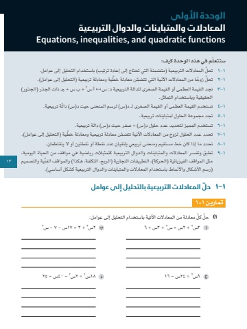 131-1ّ حل المعادالت التربيعية بالتحليل إلى عواملتمارين ١-١1ّ )حل ّ كل معادلة من المعادالت اآلتية باستخدام التحليل إلى عوامل:22 + 3 = 17س - 7 - س2 + 3س + 6 2س2 + 2س = س3س2 - 40س - 252 = 2س2 = 24س - 16 18س9سّ ستتعلم في هذه الوحدة كيف:١-١ ّ تحل المعادالت التربيعية )متضمنة التي تحتاج إلى إعادة ترتيب( باستخدام التحليل إلى عوامل.١-٢ ّ تحل ً زوج ّ ا من المعادالت اآلنية التي تتضم ّ ن معادلة خطية ومعادلة تربيعية )التحليل إلى عوامل(.2 ١ + ب س + جـ ذات الجذر )الجذور( -٣ تجد القيمة العظمى أو القيمة الصغرى للدالة التربيعية د: س أسالحقيقية وباستخدام التماثل.١-٤ تستخدم القيمة العظمى أو القيمة الصغرى لـ د)س( لرسم المنحنى حيث د)س ّ ( دالة تربيعية.١-٥ تجد مجموعة الحلول لمتباينات تربيعية.١-٦ تستخدم المميز لتحديد عدد حلول د)س( = صفر حيث د)س( دالة تربيعية.١-٧ ّ تحدد عدد الحلول لزوج من المعادالت اآلنية تتضم ّ ن معادلة تربيعية ومعادلة خطية )التحليل إلى عوامل(.١-٨ تحدد ما إذا كان خط مستقيم ومنحنى تربيعي يلتقيان عند نقطة أو نقطتين أو ال يتقاطعان.١-٩ تطبق وتفسر المعادالت والمتباينات والدوال التربيعية كتمثيالت رياضية في مواقف من الحياة اليومية، ّ مثل المواقف الفيزيائية )الحركة(، التطبيقات التجارية )الربح، التكلفة، هكذا( والمواقف الفنية والتصميم )رسم األشكال واألنماط باستخدام المعادالت والمتباينات والدوال التربيعية كشكل أساسي(.الوحدة األولى المعادالت والمتباينات والدوال التربيعيةfunctions quadratic and, inequalities, Equations 1313