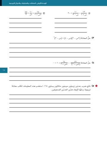الوحدة األولى: المعادالت والمتباينات والدوال التربيعية155510 = 2س + 152س + 110- = 312 - س - 3س + 12٣ّ )حل المعادلة )2س - 3()س - 5( = )س - 3)14 + 1 = 05س + 249 - )5س + 2)24ّ )حل المعادلة َين يساوي 168؛ استخدم هذه المعلومات لتكتب معادلة َين متتالي5 َ )ناتج ضرب عددين ّ زوجيين موجبّ َ ها إليجاد هذ َ ين العدد َ ين الصحيحين.تربيعية، وحل15
