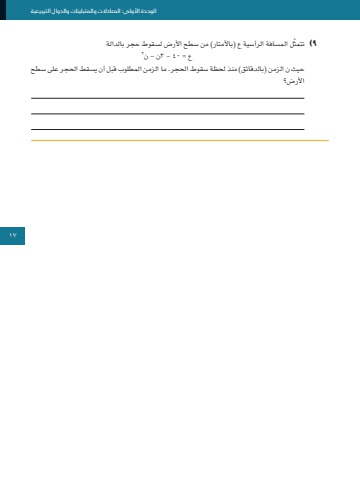 الوحدة األولى: المعادالت والمتباينات والدوال التربيعية17٩ ّ )تتمثل المسافة الرأسية ع )باألمتار( من سطح األرض لسقوط حجر بالدالة ع = 40 - 3ن - ن2 حيث ن الزمن )بالدقائق( منذ لحظة سقوط الحجر. ما الزمن المطلوب قبل أن يسقط الحجر على سطح األرض؟17