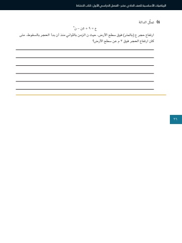الرياضيات األساسية للصف الحادي عشر - الفصل الدراسي األول: كتاب النشاط264 ّ )تمثل الدالة 2ع = 9 + 5ن - نارتفاع حجر ع )بالمتر( فوق سطح األرض، حيث ن الزمن بالثواني منذ أن بدأ الحجر بالسقوط. متى كان ارتفاع الحجر فوق 3 م عن سطح األرض؟26