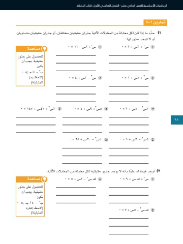 الرياضيات األساسية للصف الحادي عشر - الفصل الدراسي األول: كتاب النشاط28تمارين ١-٤1ّ )حدد ما إذا كان لكل معادلة من المعادالت اآلتية جذران حقيقيان مختلفان، أو جذران حقيقيان متساويان، أو ال توجد جذور لها:2 +2س - 11 = 02 + 3س + 3 = 0 سس2 - 3س + 4 = 02 + 2س + 1 = 0 سس2 + 42س + 147 = 02 +9س + 4 = 0 3س2 - 7س + 3 = 0 5س2س2 - 20س + 25 = 02 - 3س + 9 = 0 4س5س٢ ِ )أوج ً د قيمة ك علما بأنه ال يوجد جذور حقيقية لكل معادلة من المعادالت اآلتية:2 - 3س + 5 = 02 + ك س + 9 = 0 ك سس2 - 5س + 7 = 0ك سللحصول على جذور حقيقية، يجب أن يكون 2 - 4أجـ < 0ب)الحظ رمز المتباينة(مساعدةللحصول على جذور حقيقية، يجب أن تكون 2 - 4 أ جـ < 0ب)الحظ إشارة المتباينة(مساعدة28