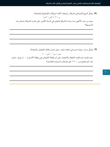 الرياضيات األساسية للصف الحادي عشر - الفصل الدراسي األول: كتاب النشاط30٨ ّ )يتمث ُ ل الربح اإلجمالي لشركة ر )بمئات آالف الرياالت العمانية( بالمعادلة2ر = 2 + 3س + 2سحيث س عدد األشهر منذ بدأت الشركة بالعمل في السنة األولى. هل عانت الشركة خسائر منذ تأسيسها؟ ٩ ّ )يتمثل مسار سيارة تسير في اتجاه محدد حول إحدى نقاط التفتيش بالمعادلة 2 - 6س - 10ص = سحيث تؤخذ إحداثيات النقاط باالعتماد على أن نقطة التفتيش هي نقطة األصل )0 ،0 .)يوجد حاجز عند المستقيم ص = -19؛ هل تصطدم السيارة بالحاجز؟30