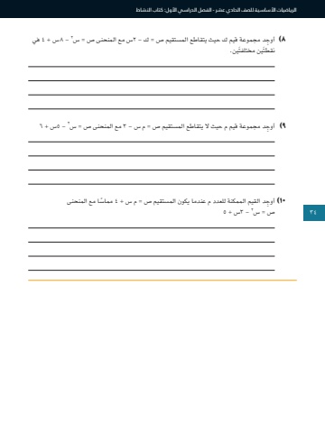 الرياضيات األساسية للصف الحادي عشر - الفصل الدراسي األول: كتاب النشاط342 - 8س + 4 في ٨ ِ )أوجد مجموعة قيم ك حيث يتقاطع المستقيم ص = ك - 2س مع المنحنى ص = سنقطتَين مختلفتَين.2 - 5س + 6٩ ِ )أوجد مجموعة قيم م حيث ال يتقاطع المستقيم ص = م س - 3 مع المنحنى ص = س1٠ ِ )أوج ً د القيم الممكنة للعدد م عندما يكون المستقيم ص = م س + 4 مماسا مع المنحنى 2 - 3س + 534 ص = س