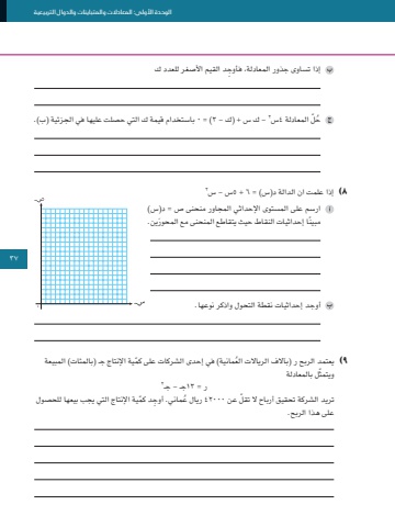 الوحدة األولى: المعادالت والمتباينات والدوال التربيعية37ِ إذا تساوى جذور المعادلة، فأوجد القيم األصغر للعدد ك2 - ك س + )ك - 3 = )0 باستخدام قيمة ك التي حصلت عليها في الجزئية )ب(. ُح ّل المعادلة 4س2٨ )إذا علمت ان الدالة د)س( = 6 + 5س - س ارسم على المستوى اإلحداثي المجاور منحنى ص = د)س( ً مبين َ ا إحداثيات النقاط حيث يتقاطع المنحنى مع المحورين.أوجد إحداثيات نقطة التحول واذكر نوعها.٩ ُ )يعتمد الربح ر )بآالف الرياالت الع ّ مانية( في إحدى الشركات على كمية اإلنتاج جـ )بالمئات( المبيعة ّ ويتمثل بالمعادلة2ر = 13جـ - جـّ تريد الشركة تحقيق أرباح ال تقل عن ُ 42000 ريال ع ِ ماني. أوج ّ د كمية اإلنتاج التي يجب بيعها للحصول على هذا الربح.٠37