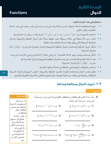 392-1 تعريف الدوال ومجالها ومداهاتمارين ٢-١ أ1ّ )حد ً د ما إذا كانت كل عالقة من العالقات اآلتية واحد ّ ا إلى واحد، أو متعد ًدا إلى واحد، أو واحدًا إلى متعدّد:2 - 4 ،س ∋س 2س + 5 ،س ∋ س 2س3 + 1 ،س ∋ س 2س + 2 ،س ∋س 3س2 + 3 ،س ̄ 0 ، س , 0 س س5س س ، س ∋ ، س =/ 1 س ± س، س ∋ ، س ̄ 614س 1 - سإذا رسمنا كل المستقيمات الرأسية الممكنة على منحنى العالقة، يمكن للعالقة أن: تكون دالة إذا تقاطع كل مستقيم ّ مع المنحنى مرة واحدة على األكثر. ال تكون دالة إذا تقاطع أحد المستقيمات مع المنحنى أكثر من ّمرة.مساعدةّ ستتعلم في هذه الوحدة كيف:٢-١ تفهم المصطلحات الدالة، المجال، المدى، الدالة واحد إلى واحد، واحد إلى متعدد، متعدد إلى واحد، الدالة العكسية، تركيب دالتَين.-1(س( و )هـ ° ٢ س()س( = هـ)د)س((.، د22 + ب س + جـ، د: س أس-٢ تستخدم الصيغ د)س( = أس٢-3 ّ تحد ّ د مدى دالة معطاة في حاالت بسيطة حيث مجالها محدٌد مثل الدوال الخطية والتربيعية والدوال التبادلية البسيطة )التي يكون فيها البسط والمقام دوال خطية(.٢-4 ّ تشك ّ ل الدوال المرك ّ بة )باستخدام الدوال الخطية والتربيعية والدوال الجذرية مثل د)س( = )أس + جـ(والدوال النسبية(.-1 ٢( ّ س( في حالة أن الدالة د)س( هي دالة واحد إلى واحد.-5 ّ تتذك ّ ر وتستخدم ويفسر وجود الدالة العكسية د٢-6 ّ تجد الدالة العكسية للدالة واحد إلى واحد )الدوال الخطية والتربيعية والدوال الجذرية مثل د)س( = )أس + جـ( والدوال النسبية(.٢-7 تستخدم التمثيالت البيانية لتبين العالقة بين الدالة ودالتها العكسية.٢-8 ّ تطبق وتفسر الدوال )باستخدام كثيرات الحدود الخطية والتربيعية، الجذور التربيعية والدوال النسبية( كتمثيالت رياضية في مواقف من الحياة اليومية، مثل التمويل والطقس واألسواق العالمية والتصنيع.39الوحدة الثانيةالدوال Functions39