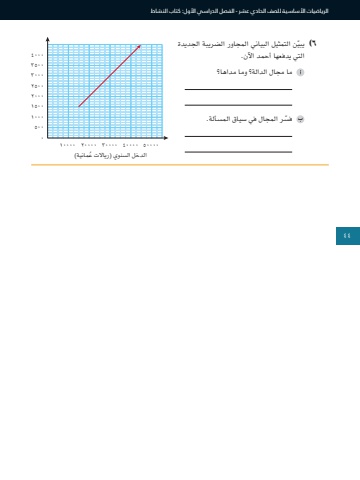44الرياضيات األساسية للصف الحادي عشر - الفصل الدراسي األول: كتاب النشاط٦ ّ )يبين التمثيل البياني المجاور الضريبة الجديدة التي يدفعها أحمد اآلن. ما مجال الدالة؟ وما مداها؟٥٠٠ّ فسر المجال في سياق المسألة.٥٠٠٠٠ ٤٠٠٠٠ ٣٠٠٠٠ ٢٠٠٠٠ ١٠٠٠٠٠١٠٠٠١٥٠٠٢٠٠٠٢٥٠٠ُ الدخل السنوي (ريالات عمانية)٣٠٠٠٣٥٠٠٤٠٠٠44
