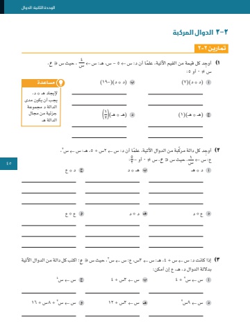 45الوحدة الثانية: الدوال2-2 الدوال المركبةتمارين ٢-٢ ، حيث س ∋ ، 41 ِ )أوجد ً كل قيمة من القيم اآلتية، علما أن د: س 5 - س، هـ: س سس =/ 0 أو 5:° د()-19)° د()7( )د )د 1)2° هـ()° هـ()1( )هـ )هـ 2 ،2 ِ )أوج ّ د كل دالة مرك ً بة من الدوال اآلتية، علما أن د: س 2س + 5 ،هـ: س س:51 ، حيث س ∋ ، س =/ 0 أو - 2سع: س° ع° د د ° هـ هـ د ° عع ° د د ° د ع 2 ،حيث س ∋ ؛ اكتب كل دالة من الدوال اآلتية 3 )إذا كانت د: س س + 4 ،هـ: س 3س، ع: س سبداللة الدوال د، هـ، ع إن أمكن: 42 + 4 س 3س + 4 س سس س2 + 8س + 16س 3س + 12 س س2س 9س° د، إليجاد هـ يجب أن يكون مدى الدالة د مجموعة جزئية من مجال الدالة هـمساعدة45