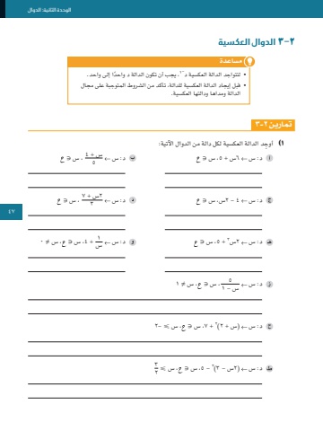 47الوحدة الثانية: الدوال2-3 الدوال العكسيةتمارين ٢-31 ِ )أوجد الدالة العكسية لكل دالة من الدوال اآلتية: ، س ∋س + 4د: س 6س + 5 ،س ∋ د: س 5 ، س ∋2س + 7د: س 4 - 2س، س ∋ د: س 3 + 4 ،س ∋ ، س =/ 013 + 5 ،س ∋ د: س سد: س 2س ، س ∋ ، س =/ 15س - 1د: س2 + 7 ،س ∋ ، س < -2د: س )س + 2)32 - 5 ،س ∋ ، س < 2د: س )2س - 3)-1 ، ً يجب أن تكون الدالة د واحدا إلى واحد.لتتواجد الدالة العكسية د قبل إيجاد الدالة العكسية للدالة، تأكد من الشروط المتوجبة على مجال الدالة ومداها ودالتها العكسية.مساعدة47
