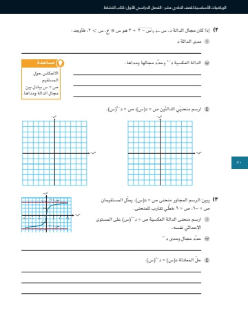 50الرياضيات األساسية للصف الحادي عشر - الفصل الدراسي األول: كتاب النشاط2 )إذا كان مجال الدالة د. س س - 2 + 3 هو س ∋ ، س , 2 ،فأوجد:مدى الدالة د-1 وحدّد مجالها ومداها.الدالة العكسية د-1(س(.ارسم منحنيَي الدالتَين ص = د)س(، ص = د3 )يبين الرسم المجاور ّ منحنى ص = د)س(. يمثل المستقيمان ص = - َّ 9 ،ص = 9 خطي تقارب للمنحنى.-1(س( على المستوى ارسم منحنى الدالة العكسية ص = داإلحداثي نفسه.-1حدّد مجال ومدى د-1(س(. ّحل المعادلة د)س( = داالنعكاس حول المستقيم ص = س يبادل بين مجال الدالة ومداها.مساعدة٠١٠٥-٥-١٠١٥ ١٠ ٥- ٥- ١٠- ١٥ص = ٩ص = -٩50
