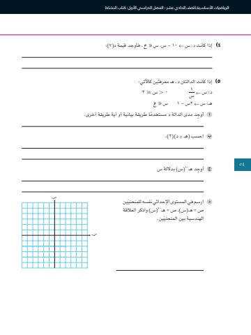 54الرياضيات األساسية للصف الحادي عشر - الفصل الدراسي األول: كتاب النشاط4 )إذا كانت د: س 10 - س، س ∋ ، فأوجد قيمة د)7:)٥ )إذا كانت الدالتان د، هـ معرفتَين كاآلتي:1 0 . س > 3سد: س هـ: س 2س - 1 س ∋ِ أوج ً د مدى الدالة د مستخدما طريقة بيانية أو أية طريقة أخرى.° د()2.)احسب )هـ -1(س( بداللة سِ أوجد هـَين ارسم في المستوى اإلحداثي نفسه للمنحني-1(س( واذكر العالقة ص = هـ)س(، ص = هـَين.الهندسية بين المنحني54