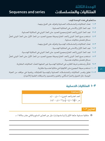 56٣-1 المتتاليات الحسابيةتمارين ٣-1ّ ّ ر عن الحدين السابع والثاني عشر بداللة أ، د1 )متتالية ّ حسابية حدها األول )أ( وأساسها )د(؛ عبالحد العام )الحد النوني( = أ + )ن - 1)دن )٢ أ + )ن - 1)د(1٢ن )أ + ل( = ٢ن = جـمساعدةالوحدة الثالثةالمتتاليات والمتسلسالت series and Sequencesّ ستتعلم في هذه الوحدة كيف:٣-1 ّ تحد ّ د المتتاليات والمتسلسالت الحسابية وتتعرف على الفرق بينهما. ٣-2 ّ تجد الحد األول واألساس في المتتالية الحسابية.٣-٣ ّ تجد الحد ّ النوني )الحد العام( ومجموع الحدود حتى الحد النوني في المتتالية الحسابية.٣-4 ّ تستخدم صيغ الحد ّ النوني )الحد العام( وصيغة مجموع الحدود من الحد ّ األول حتى الحد ّ النوني لتحلّ مسائل تتضمن متتاليات حسابية.٣-5 ّ تحد ّ د المتتاليات والمتسلسالت الهندسية وتتعرف على الفرق بينهما. ٣-6 ّ تجد الحد األول واألساس في المتتالية الهندسية.٣-7 ّ تجد الحد ّ النوني )الحد العام( ومجموع الحدود حتى الحد النوني في المتتالية الهندسية.٣-8 ّ تستخدم صيغ الحد ّ النوني )الحد العام( وصيغة مجموع الحدود من الحد ّ األول حتى الحد ّ النوني لتحلّ مسائل تتضمن متتاليات هندسية.٣-9 ّ تتذك ّ ر وتستخدم شرط التقارب في المتتالية الهندسية غير المنتهية لتحدد المتتاليات المتقاربة.٣-10 تستخدم صيغة المجموع حتى الالنهاية في متتالية هندسية متقاربة.٣-11 تطبق وتفسر المتتاليات والمتسلسالت الحسابية والهندسية كتمثيالت رياضية في مواقف من الحياة ّ اليومية، مثل التمويل والنمو ّ السكاني، والفنون والتصميم، والسياقات العلمية )األحياء(.5656