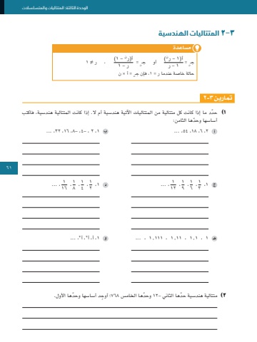 61الوحدة الثالثة: المتتاليات والمتسلسالت٣-2 المتتاليات الهندسيةتمارين ٣-21ّ )حدد ما إذا كانت كل متتالية من المتتاليات اآلتية هندسية أم ال. إذا كانت المتتالية هندسية، فاكتب ّ أساسها وحدها الثامن:٢ ،6 ،18 ،54 ... ،1 ،٢- ، 4- ،8 ،16 ،3٢... ،1... ، 1 ، 1681 ، 41 ، ٢1 ... ، 1 ،1٢1 ، 91 ، 61 ، 31 ،1 ، 1.1 ، 11.1 ، 111.1 ... ، 1 ،أ، أ٢ ،أ3... ،2 ّ )متتالية هندسية حدها الثاني -٢ ّ 1 وحد ِ ها الخامس 768؛ أوج ّ د أساسها وحدها األول. ، ر =/ 1ن - 1)أ)رن = ر - 1( أو جـنأ)1 - رن = 1 - رجـن = أ × نحالة خاصة عندما ر = 1 ،فإن جـمساعدة61