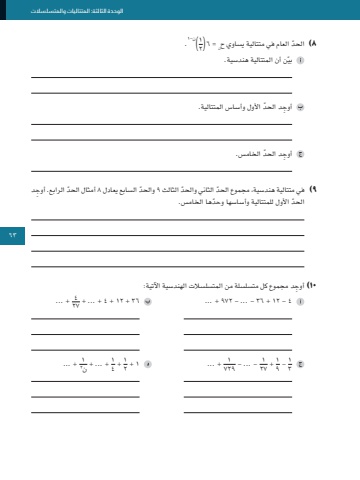 63الوحدة الثالثة: المتتاليات والمتسلسالت.1)ن-1٢ن = 6( ٨ ّ )الحد العام في متتالية يساوي ح ّبين أن المتتالية هندسية. ِ أوج ّ د الحد األول وأساس المتتالية. ِ أوج ّ د الحد الخامس.٩ ّ )في متتالية هندسية، مجموع الحد ّ الثاني والحد الثالث ّ 9 والحد السابع يعادل ّ 8 أمثال الحد ِ الرابع. أوجد ّ الحد ّ األول للمتتالية وأساسها وحدها الخامس.1٠ ِ )أوجد مجموع كل متسلسلة من المتسلسالت الهندسية اآلتية: + ...4٢74 - 1٢ + 36 - ... - 97٢ ... + 36 + 1٢ + 4 + ... + + ...1ن٢ + ... + 14 + 1٢ + ... 1 + 17٢91 - ... - ٢7 + 191 - 363