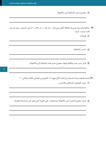 67الوحدة الثالثة: المتتاليات والمتسلسالتمجموع حدود المتتالية إلى ماالنهاية.٩ )متتالية هندسية حدودها الثالثة األولى هي )ك - 8( ،)ك + 4( ،)3ك + ٢ )على الترتيب، حيث ك عدد ِ ثابت موجب. أوجد:قيمة كأساس المتتالية.ّفسر سبب عدم إمكانية إيجاد مجموع حدود هذه المتتالية إلى ماالنهاية.1٠ ّ )متسلسلة هندسية أساسها )ر( والحد األول فيها 64 َّ ؛ الفرق بين الحدين الثالث والثاني ٢0ِ أوجد القيمتَين الممكنتَين لألساس ر ِ أوجد مجموع الحدود إلى ماالنهاية حيث قيمة ر هي القيمة التي تقود إلى متسلسلة متقاربة.67