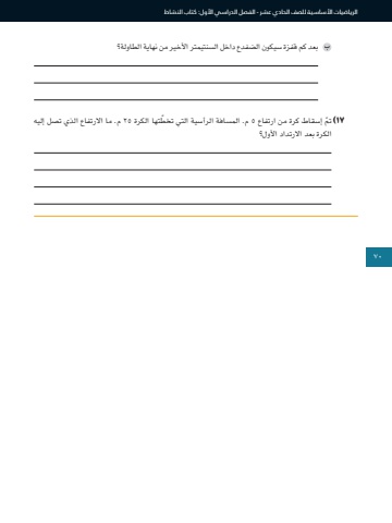 70الرياضيات األساسية للصف الحادي عشر - الفصل الدراسي األول: كتاب النشاط بعد كم قفزة سيكون الضفدع داخل السنتيمتر األخير من نهاية الطاولة؟1٧ّ )تم إسقاط كرة من ارتفاع ّ 5 م. المسافة الرأسية التي تخطتها الكرة ٢5 م. ما االرتفاع الذي تصل إليه الكرة بعد االرتداد األول؟70