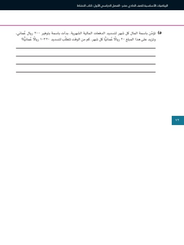 72الرياضيات األساسية للصف الحادي عشر - الفصل الدراسي األول: كتاب النشاط٥ ّ )تؤمن باسمة المال كل شهر لتسديد الدفعات المالية الشهرية. بدأت باسمة بتوفير ٢00 ُ ريال عماني، ًا؟ّب لتسديد 103٢0 رياًال ُ ع ّ مانيًا كل شهر. كم من الوقت تتطلوتزيد على هذا المبلغ ٢0 رياًال ُ ع ّ ماني72