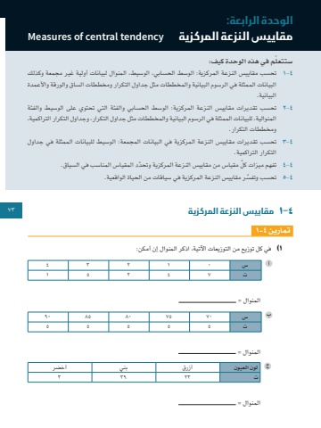 ٤-1 مقاييس النزعة المركزية 73تمارين ٤-١1 )في كل توزيع من التوزيعات اآلتية، اذكر المنوال إن أمكن:س 0 1 2 3 4ت 7 4 2 5 1المنوال = س 70 75 80 85 90ت 5 5 5 5 5المنوال = لون العيون أزرق بني أخضرت 23 39 3المنوال = الوحدة الرابعة:مقاييس النزعة المركزية tendency central of Measuresّ ستتعلم في هذه الوحدة كيف:٤-١ تحسب مقاييس النزعة المركزية: الوسط الحسابي، الوسيط، المنوال لبيانات أولية غير مجمعة وكذلك البيانات الممثلة في الرسوم البيانية والمخططات مثل جداول التكرار ومخططات الساق والورقة واألعمدة البيانية.٤-2 تحسب تقديرات مقاييس النزعة المركزية: الوسط الحسابي والفئة التي تحتوي على الوسيط والفئة المنوالية، للبيانات الممثلة في الرسوم البيانية والمخططات مثل جداول التكرار، وجداول التكرار التراكمية، ومخططات التكرار.٤-3 تحسب تقديرات مقاييس النزعة المركزية في البيانات المجمعة: الوسيط للبيانات الممثلة في جداول التكرار التراكمية.٤-٤ ّ تفهم ميزات كل ّ مقياس من مقاييس النزعة المركزية وتحدد المقياس المناسب في السياق.٤-5 ّ تحسب وتفسر مقاييس النزعة المركزية في سياقات من الحياة الواقعية.73