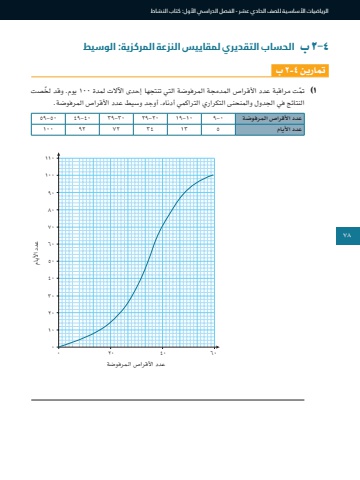 78الرياضيات األساسية للصف الحادي عشر - الفصل الدراسي األول: كتاب النشاط٤-2ب الحساب التقديري لمقاييس النزعة المركزية: الوسيطتمارين ٤-٢ ب1ّ )تمت مراقبة عدد األقراص المدمجة المرفوضة التي تنتجها إحدى اآلالت لمدة ّ 100 يوم. وقد لخصت النتائج في الجدول والمنحنى التكراري التراكمي أدناه. أوجد وسيط عدد األقراص المرفوضة.عدد األقراص المرفوضة 0-9 10-19 20-29 30-39 40-49 50-59عدد األيام 5 13 34 72 92 100عدد الأقراص الـمرفوضة٠٦٠ ٤٠ ٢٠ ٠١٠٢٠٣٠٤٠٥٠٦٠٧٠٨٠٩٠١٠٠١١٠عدد الأيام78