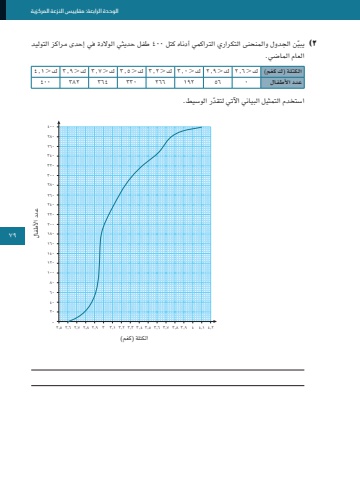 79الوحدة الرابعة: مقاييس النزعة المركزية2 ّ )يبين الجدول والمنحنى التكراري التراكمي أدناه كتل 400 طفل حديثي الوالدة في إحدى مراكز التوليد العام الماضي. الكتلة )ك كغم( ك . ٦.2 ك . 9.2 ك . 0.3 ك . 2.3 ك . 5.3 ك . 7.3 ك . 9.3 ك . 1.4عدد األطفال 0 5٦ 192 2٦٦ 330 3٦4 382 400ّ استخدم التمثيل البياني اآلتي لتقدر الوسيط.الكتلة (كغم)٠٤٫٢ ٤٫١ ٤ ٣٫٩ ٣٫٨ ٣٫٧ ٫٦ ٫٥ ٣ ٣٫٤ ٫٣ ٣ ٣٫٢ ٣ ٣٫١ ٣ ٢٫٩ ٫٨ ٢٫٧ ٢ ٢٫٦ ٢٫٥٢٠٤٠١٠٠١٢٠٨٠٦٠١٦٠١٤٠٢٠٠١٨٠٢٢٠٣٠٠٢٨٠٢٦٠٢٤٠٣٢٠٣٤٠٤٠٠٢٨٠٢٦٠عدد الأطفال79