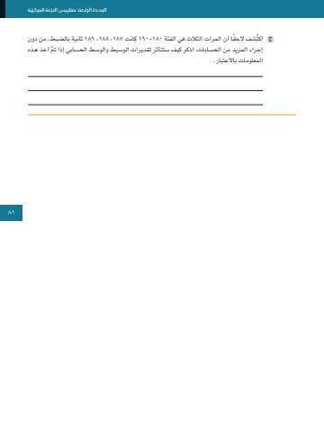 81الوحدة الرابعة: مقاييس النزعة المركزية اكتُ ً شف الحقا أن المرات الثالث في الفئة 180-190 كانت 187 ،188 ،189 ثانية بالضبط. من دون ّ إجراء المزيد من الحسابات، اذكر كيف ستتأثر تقديرات الوسيط والوسط الحسابي إذا تم أخذ هذه المعلومات باالعتبار.81