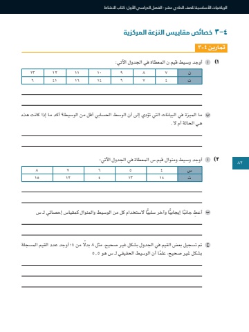 82الرياضيات األساسية للصف الحادي عشر - الفصل الدراسي األول: كتاب النشاط٤-3 خصائص مقاييس النزعة المركزيةتمارين ٤-٣1 )أوجد وسيط قيم ن المعطاة في الجدول اآلتي:ن 7 8 9 10 11 12 13ت 4 7 9 14 1٦ 41 9 ما الميزة في البيانات التي تؤدي إلى أن الوسط الحسابي أقل من الوسيط؟ أكد ما إذا كانت هذه هي الحالة أم ال.2 )أوجد وسيط ومنوال قيم س المعطاة في الجدول اآلتي:س 4 5 ٦ 7 8ت 14 13 4 12 15ًا الستخدام كل من الوسيط والمنوال كمقياس إحصائي لـ سً ّ ا وآخر سلبي ِ أعط ً جانب ّ ا إيجابي تم تسجيل بعض القيم في الجدول بشكل غير صحيح، مثل 8 بدًال من 4؛ أوجد عدد القيم المسجلة ً بشكل غير صحيح، علما أن الوسيط الحقيقي لـ س هو 5.582