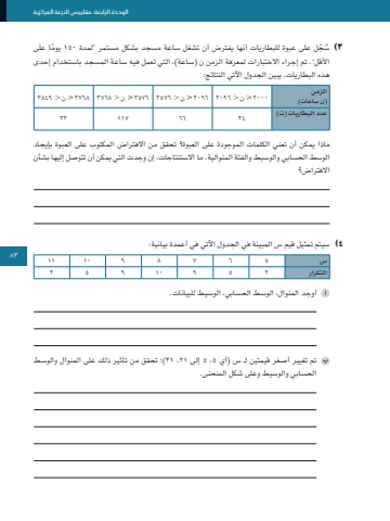83الوحدة الرابعة: مقاييس النزعة المركزية3ُ )س ّجل على عبوة للبطاريات أنها يفترض أن تشغل ساعة مسجد بشكل مستمر ’لمدة ً 150 يوما على األقل‘. تم إجراء االختبارات لمعرفة الزمن ن )ساعة(، التي تعمل فيه ساعة المسجد باستخدام إحدى هذه البطاريات. يبين الجدول اآلتي النتائج:الزمن 3000 < ن . 309٦ 309٦ < ن . 357٦ 357٦ < ن . 37٦8 37٦8 < ن . 3849( ن ساعات(34 ٦٦ 117 33 عدد البطاريات )ت(ماذا يمكن أن تعني الكلمات الموجودة على العبوة؟ تحقق من االفتراض المكتوب على العبوة بإيجاد الوسط الحسابي والوسيط والفئة المنوالية. ما االستنتاجات، إن وجدت التي يمكن أن تتوصل إليها بشأن االفتراض؟٤ )سيتم تمثيل قيم س المبينة في الجدول اآلتي في أعمدة بيانية:س 5 ٦ 7 8 9 10 11التكرار 2 5 9 10 9 5 2أوجد المنوال، الوسط الحسابي، الوسيط للبيانات. تم تغيير أصغر قيمتين لـ س )أي 5 ،5 إلى 21 ،31)؛ تحقق من تأثير ذلك على المنوال والوسط الحسابي والوسيط وعلى شكل المنحنى.83