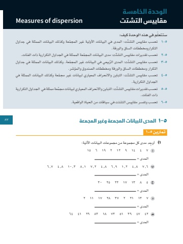 5-1 المدى للبيانات المجمعة وغير المجمعة 87تمارين 5-١1 ِ )أوجد مدى كل مجموعة من مجموعات البيانات اآلتية:7 4 14 9 12 2 19 6 15 المدى = 6.7 8.4 2.1 9.6 8.4 2.7 1.8 3.10 8.4 7.6المدى = 5 8 13 17 22 25 30 المدى = 7 13 21 2 37 28 17 11 2 المدى = 42 47 39 51 73 18 83 29 41 64 المدى = الوحدة الخامسةمقاييس التشتت dispersion of Measuresّ ستتعلم في هذه الوحدة كيف:٥-1 ّ تحسب مقاييس التشت ّ ت: المدى في البيانات األولية غير المجمعة وكذلك البيانات الممثلة في جداول التكرارومخططات الساق والورقة.٥-2 ّ تحسب تقديرات مقاييس التشت ّ ت: مدى البيانات المجمعة الممثلة في الجداول التكرارية ذات الفئات.٥-3 ّ تحسب مقاييس التشت ُ ت: المدى الر ّ بيعي في البيانات غير المجمعة. وكذلك البيانات الممثلة في جداول التكرار ومخططات الساق والورقة ومخططات الصندوق والمؤشر.٥-4 ّ تحسب مقاييس التشت ّ ت: التباين واالنحراف المعياري لبيانات غير مجمعة وكذلك البيانات الممثلة في الجداول التكرارية.٥-٥ ّ تحسب تقديرات مقاييس التشت ّ ت: التباين واالنحراف المعياري لبيانات مجمعة ممثلة في الجداول التكرارية ذات الفئات.٥-6 تحسب وتفسر مقاييس التشتت في سياقات من الحياة الواقعية.87