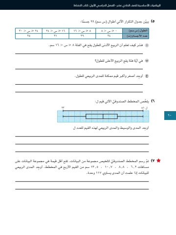 90الرياضيات األساسية للصف الحادي عشر - الفصل الدراسي األول: كتاب النشاط5 ّ )يبي ً ن جدول التكرار اآلتي أطوال )س سم( 99 جسما:الطول )س سم( 0 < س . 8 8 < س . 16 16 < س . 24 24 < س . 30عدد األجسام )ت( 24 29 21 25ّفسر كيف تعلم أن الربيع األدنى للطول يقع في الفئة 8 < س . 16 سم.ّ في أية فئة يقع الربيع األعلى للطول؟ِ أوجد أصغر وأكبر قيم ممكنة للمدى الربيعي للطول.6 ّ )يلخ ّ ص المخطط الصندوقي األتي قيم ل:ل ٥١ ٢٣ِ أوجد المدى والوسيط والمدى الربيعي لهذه القيم للعدد ل7ّ )تم ّ رسم المخطط الصندوقي لتلخيص مجموعة من البيانات. تقع أقل قيمة في مجموعة البيانات على مسافات 2.6 ، 8.8 ، 7.10 ِ ، 5.13 سم من القيم األربع في المخطط. أوجد المدى الربيعي للبيانات إذا علمت أن المدى يساوي 117 وحدة.90