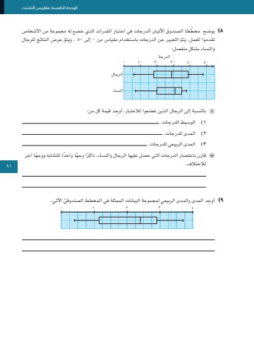 91الوحدة الخامسة: مقاييسالتشتت8 ّ )يوضح مخططا الصندوق اآلتيان الدرجات في اختبار القدرات الذي خضع له مجموعة من األشخاص ّ تقدموا للعمل. يتم التعبير عن الدرجات باستخدام مقياس من 0 إلى ّ 50 ، ويتم عرض النتائج للرجال والنساء بشكل منفصل:٥٠ ٤٠ ٣٠ ٠ ١٠ ٢ ٠الدرجةالرجالالنساءِ بالنسبة إلى الرجال الذين خضعوا لالختبار، أوجد قيمة كل من:١ )الوسيط للدرجات. ٢ )المدى للدرجات. ٣ )المدى الربيعي للدرجات. ً قارن باختصار الدرجات التي حصل عليها الرجال والنساء، ذاكر ً ا وجه ً ا واحد ً ا للتشابه ووجها آخر لالختالف.9 ِ )أوجد ا ّ لمدى والمدى الربيعي لمجموعة البيانات الممثلة في المخطط الصندوقي اآلتي:٤ ٣ ٢ ١ ٠91