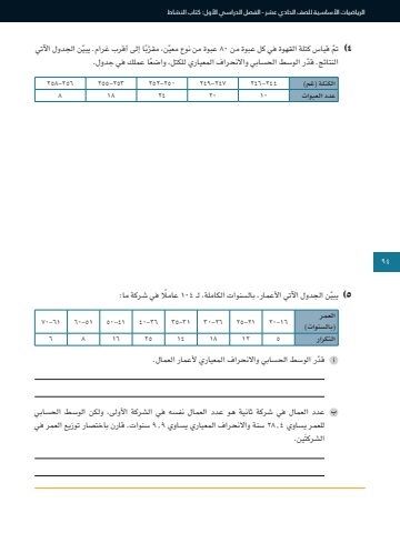 94الرياضيات األساسية للصف الحادي عشر - الفصل الدراسي األول: كتاب النشاط٤ّ )تم ّ قياس كتلة القهوة في كل عبوة من 80 عبوة من نوع معي ّ ن، مقرًب ّ ا إلى أقرب غرام. يبين الجدول اآلتي ّ النتائج. قد ً ر الوسط الحسابي واالنحراف المعياري للكتل، واضعا عملك في جدول.الكتلة )غم( 244-246 247-249 250-252 253-255 256-258عدد العبوات 10 20 24 18 85 ّ )يبين الجدول اآلتي األعمار، بالسنوات الكاملة، لـ 104 عام ًال في شركة ما:العمر 16-20 21-25 26-30 31-35 36-40 41-50 51-60 61-70( بالسنوات(التكرار 5 12 18 14 25 16 8 6ّقدر الوسط الحسابي واالنحراف المعياري ألعمار العمال. عدد العمال في شركة ثانية هو عدد العمال نفسه في الشركة األولى، ولكن الوسط الحسابي للعمر يساوي 4.28 سنة واالنحراف المعياري يساوي 9.9 سنوات. قارن باختصار توزيع العمر في الشركتَين.94