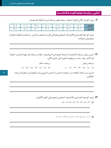 97الوحدة الخامسة: مقاييسالتشتت1 ّ )يبين الجدول اآلتي أطوال أجنحة، سبعة صقور وسبعة نسور البالغة بالسنتيمتر: الصقور 7.22 5.22 9.21 1.24 4.23 7.20 9.24النسور 6.22 1.24 5.23 8.21 0.21 4.24 8.22ِ أوج َ د الوسط الحسابي واالنحراف المعياري لجناحي كل من الصقور والنسور، واستخدم نتائجك لمقارنة مجموعتَي البيانات.2 ّ )أجرى رياض وسالم االختبارات السبعة نفسها في الرياضيات، وكانت درجات كل منهما تتحس ً ن اختبارا تلو اآلخر. وقد جاءت درجاتهما المئوية على النحو اآلتي:درجات رياض درجات سالم15 24 28 33 39 42 50 51 65 69 72 78 83 86اشرح س َ بب انتفاء الفائدة من استخدام المدى أو المدى الربيعي وحده كمقياسين لمقارنة درجات َين.الطالب٣ ِ )أوجد الوسط الحسابي واالنحراف المعياري لمجموعتَي القيم اآلتيتَين:27 ،43 ،29 ،34 ،53 ،37 ،19 ،582.6- ،5.8 ،7.7- ،3.4 ،5.13- ،9.11َ تمارين مراجعة نهاية الوحدة الخامسة97