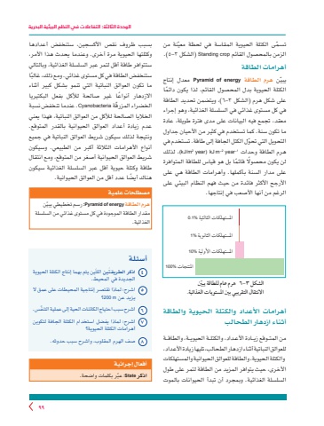 الوحدة الثالثة: التفاعالت في النظم البيئية البحرية99ّ تسـمى الكتلة الحيوية المقاسة ّ في لحظة معينة من الزمن بالمحصول القائم crop Standing( الشكل 3-٥ .)أهرامات الطاقةّ يبين هرم الطاقة energy of Pyramid معدل إنتاج ً الكتلة الحيوية بدل المحصول القائم، لذا يكون دائما على شكل هرم )الشكل 3-٦ ،)ويتضمن تحديد الطاقة في كل مستوى غذائي في السلسلة الغذائية، وهو إجراء معقد، تجمع فيه البيانات على مدى فترة طويلة، عادة ما تكون سنة. كما تستخدم في كثير من األحيان جداول ّ التحويل التي تحول الكتل الجافة إلى طاقة. تستخدم في لذلك(، kJ/m2 year( kJ m–2 year–1 وحدات الطاقة هرملن يكون محصوًل ً قائما بل هو قياس للطاقة المتوافرة على مدار السنة بأكملها. وأهرامات الطاقة هي على األرجح األكثر فائدة من حيث فهم النظام البيئي على الرغم من أنها األصعب في إنتاجها.أهرامات األعداد والكتلة الحيوية والطاقة أثناء ازدهار الطحالبمن المتــوقع زيــادة األعـداد، والكتلــة الحيويــة، والطاقــة للعوالق النباتية أثناء ازدهار الطحالب، تليها زيادة األعداد، والكتلة الحيوية، والطاقة للعوالق الحيوانية والمستهلكات األخرى، حيث يتوافر المزيد من الطاقة لتمر على طول السلسلة الغذائية. وبمجرد أن تبدأ الحيوانات بالموت بسبب ظروف نقص األكسجين، ستنخفض أعدادها وكتلتها الحيوية مرة أخرى. وعندما يحدث هذا األمر، ستتوافر طاقة أقل لتمر عبر السلسلة الغذائية، وبالتاليً ستنخفض الطاقة في كل مستوى غذائي. ومع ذلك، غالباما تكون العوالق النباتية التي تنمو بشكل كبير أثناء االزدهار ً أنواعا غير صالحة لألكل بفعل البكتيريا ّ الخضراء المزرقة Cyanobacteria .عندما تنخفض نسبةالخاليا الصالحة لألكل من العوالق النباتية، فهذا يعني عدم زيادة أعداد العوالق الحيوانية بالقدر المتوقع. ونتيجة لذلك سيكون شريط العوالق النباتية في جميع أنواع األهرامات الثالثة أكبر من الطبيعي. وسيكون شريط العوالق الحيوانية أصغر من المتوقع، ومع انتقالطاقة وكتلة حيوية أقل عبر السلسلة الغذائية سيكون ً هناك أيضا عدد أقل من العوالق الحيوانية.الشكل 3-٦ هرم عام للطاقة يبّياالنتقال التقريبي بني املستويات الغذائية.املستهلكات الثالثية %1.0املستهلكات الثانوية %1املستهلكات األولية املنتجات 0أسئلة4 اذكر َ الطريقتين اللتَين يتم بهما إنتاج الكتلة الحيوية الجديدة في المحيط.5 اشرح: لماذا تقتصر إنتاجية المحيطات على عمق ال يزيد عن m 200؟6 ّ اشرح سبب احتياج الكائنات الحية إلى عملية التنفس.7 اشرح: لماذا يفضل استخدام الكتلة الجافة لتكوين أهرامات الكتلة الحيوية؟8 صف الهرم المقلوب، واشرح سبب حدوثه.أفعال إجرائيةّر بكلمات واضحة.اذكر State :عبمصطلحات علميةهرم الطاقة energy of Pyramid ّ :رسم تخطيطي يبين مقدار الطاقة الموجودة في كل مستوى غذائي من السلسلة الغذائية.