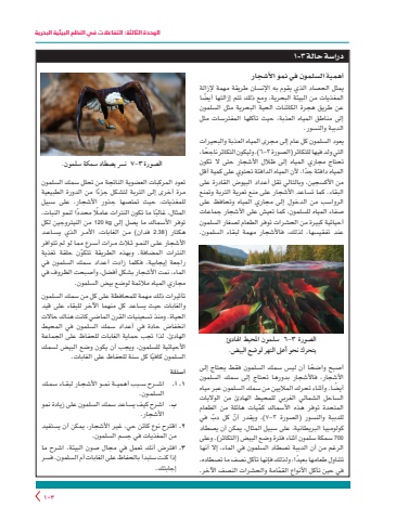 الوحدة الثالثة: التفاعالت في النظم البيئية البحرية103دراسة حالة ٣-١أهمية السلمون في نمو األشجاريمثل الحصاد الذي يقوم به اإلنسان طريقة مهمة إلزالة المغذيات ً من البيئة البحرية، ومع ذلك تتم إزالتها أيضا عن طريق هجرة الكائنات الحية البحرية مثل السلمون إلى مناطق المياه العذبة، حيث تأكلها المفترسات مثل الدببة والنسور. يعود السلمون كل عام إلى مجرى المياه العذبة والبحيرات التي ولد فيها للتكاثر )الصورة 3-6 .) ً وليكون التكاثر ناجحا، تحتاج مجاري المياه إلى ظالل األشجار حتى ال تكون ً المياه دافئة جدا، ألن المياه الدافئة تحتوي على كمية أقل من األكسجين، وبالتالي تقل أعداد البيوض القادرة على البقاء. كما تساعد األشجار على منع تعرية التربة وتمنع الرواسب من الدخول إلى مجاري المياه وتحافظ على صفاء المياه للسلمون، كما تعيش على األشجار جماعات أحيائية كبيرة من الحشرات توفر الطعام لصغار السلمون عند تفقيسها، لذلك، فاألشجار مهمة لبقاء السلمون. الصورة 3-6 سلمون املحيط اهلادئ يتحرك نحو أعىل النهر لوضع البيض. ً أصبح واضحا أن ليس سمك السلمون فقط يحتاج إلى األشجار، فاألشجار بدورها تحتاج إلى سمك السلمون ً أيضا. وأثناء تحرك الماليين من سمك السلمون عبر مياه الساحل الشمالي الغربي للمحيط الهادئ من الواليات ّ المتحدة توفر هذه األسماك كميات هائلة من الطعام للدببة والنسور )الصورة 3-7 . ّ )ويقدر أن ّ كل دب في كولومبيا البريطانية، على سبيل المثال، يمكن أن يصطاد 700 سمكة سلمون أثناء فترة وضع البيض )التكاثر(. وعلى الرغم من أن الدببة تصطاد السلمون في الماء، إال أنها ت ً تناول طعامها بعيدا، ولذلك فإنها تأكل نصف ما تصطاده، في حين تأكل األنواع ّ القمامة والحشرات النصف اآلخر. الصورة 3-7 نرس يصطاد سمكة سلمون. تعود المركبات العضوية الناتجة من تحلل سمك السلمون ً مرة أخرى إلى التربة لتشكل جزءا من الدورة الطبيعية للمغذيات، حيث تمتصها جذور األشجار. على سبيل ً المثال، غالبا ما تكون النترات عام ًل ً محددا لنمو النبات. توفر األسماك ما يصل إلى kg 120 من النيتروجين لكل هكتار )38.2 فدان( مـن الغابات، األمـر الذي يسـاعـد األشجار علـى النمـو ثـالث مـرات أسـرع مما لو لم تتوافر ّ النترات المضافة. وبهذه الطريقة تتكون حلقة تغذية راجعة إيجابية. فكلما زادت أعداد سمك السلمون في الماء، نمت األشجار بشكل أفضل، وأصبحت الظروف في مجاري المياه مالئمة لوضع بيض السلمون.تأثيرات ذلك مهمة للمحافظة على كل من سمك السلمون والغابات حيث يساعد كل منهما اآلخر للبقاء على قيد الحياة. ومنذ تسعينيات القرن الماضي كانت هناك حاالت انخفاض حادة في أعداد سمك السلمون في المحيط الهادئ. لذا تجب حماية الغابات للحفاظ على الجماعة األحيائية للسلمون، ويجب أن يكون وضع البيض لسمك ً السلمون كافيا كل سنة للحفاظ على الغابات.أسئلة1 .أ. اشــرح ســبب أهميــة نمــو األشجـار لبقـاء سمـك السلمـون.ب. اشرح كيف يساعد سمك السلمون على زيادة نمو األشجار.٢ .اقترح نوع كائن حي، غير األشجار، يمكن أن يستفيد من المغذيات في جسم السلمون.3 .افترض أنك تعمل في مجال صون البيئة، اشرح ما إذا كنت ستبدأ بالحفاظ على الغابات أم السلمون. فسر إجابتك.