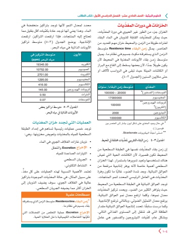 العلوم البيئية - الصف الحادي عشر - الفصل الدراسي األول: كتاب الطالب 104ّ الخزانات في دورات المغذيات الخزان جزء من الطور غير الحيوي في دورة ّ المغذيات، حيث يمكن ّ للمغذيات القابلة للذوبان في الماء البقاء لفترات طويلة من الزمن، والمحيط خزان مهـم للعديد من العناصر. يمـثل زمن البقـاء time Residence متوسـط الـزمن الـذي يستغرقـه مكوث جسيم فـي نظـام مـا. يميـل متوسـط زمـن بقاء األيونات المغذية في المحيط ألن يكون طويًل ً جـدا، ألن بعضها يسقط إلى القاع مع البراز أو الكائنات الميتة حيث تبقى في الرواسب آلالف أو حتى ماليين السنين )الجدول 3-4.)ّ المغذي متوسط زمن البقاء/ سنوات*)الفسفور )الفوسفات 100 000 – 20 00017 000 000 المغنيسيومكربونات الهيدروجين**)الكربون(*100 000النيتروجين 20001 000 000 الكالسيوم* في حال وجود المغذي على شكل أيون، يشار إلى العنصر بين قوسين ) (.** ّ تسم ً ى أحيانا البيكربونات Bicarbonate.اجلدول 3-4 ّ زمن البقاء التقريبي ملغذيات خمتلفة يف املحيط.إن ّ زمن بقاء المغذيات نفسها في الطبقة السطحية من المحيط تكون قصيرة، ألن الكائنات الحية التي تعيش هناك تستخدمها وتعيد تدويرها باستمرار. لهذا الخزان السطحي أهمية خاصة ألنه يوفر إنتاجية مرتفعة من ً العوالق النباتية. وبعد شدة الضوء، غالبا ما تكون وفرة ّ المغذيات هي العامل الرئيسي المحدد لنمو المنتجات.توجد العوالق النباتية في الطبقة السطحية من المحيط حيث يتوافر الكثير من الضوء. ويحدد تركيز ّ المغذياتمعدل نموها، وكلما ارتفع معدل نمو العوالق النباتية، يرتفع معدل التمثيل الضوئي، وبالتالي ترتفع اإلنتاجية. ً وكما درست سابقا، تحدد إنتاجية العوالق النباتية مقدار الطاقة التي قد تنتقل إلى المستوى الغذائي التالي. ّ وبشكل عام، كميات النيتروجين والفسفور هي عامل محدد لمعدل النمو ألنها توجد بتراكيز منخفضة في ّ الماء. وهذا يعني أنها توجد عادة بكميات أقل بقليل مما تحتاج إليه المنتجات. فإذا ارتفعت التراكيز، ارتفعت اإلنتاجية. يوضح الجدول )3-٥ )متوسط تراكيزاأليونات الذائبة في مياه البحر.األيون متوسط التركيز في مياه البحر )ppm)19345.00 الكلوريد10752.00 الصوديوم2701.00 الكبريت1295.00 المغنيسيوم416.00 الكالسيومكربونات الهيدروجين 00.1450.50 النترات0.07 الفوسفاتاجلدول 3-5 متوسط تراكيز بعض األيونات الذائبة يف مياه البحر.العمليات التي تجدد خزان المغذيات توجد خمس عمليات رئيسية تساهم في إمداد الطبقة السطحية للمياه بالمغذيات وتعويض مخزونها، وهي:● ذوبان غازات الغالف الجوي في الماء● اإلخراج Excretion والتحلل● التيارات الصاعدة للمياه● الجريان السطحي● النشاط التكتوني.مغذ. تعتمد األهمية النسبية لهذه العمليات على كل ٍّعلى سبيل المثال، في حالة ّ المغذيات الموجودة بتراكيز عالية في الغالف الجوي، سوف يضيف الذوبان إلى الخزان أكثر مما يضيفه الجريان السطحي. مصطلحات علمية*زمن البقاء time Residence :متوسط الزمن الذي يستغرقه بقاء جسيم في نظام ما. اإلخراج Excretion :عملية التخلص من الفضالت التي ّ تكونها التفاعالت الكيميائية داخل الخاليا الحية.