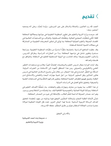 ّ الحمد هلل رب العالمين، والصالة والسالم على خير المرسلين، سي ُ دنا م َّحمد، وعلى آله وصحبه أجمعين. وبعد:لقد حرصت وزارة التربية والتعليم على تطوير المنظومة التعليمية في جوانبها ومجاالتها المختلفة الم ّ ستجدات العالمية في عاته المستقبلية، ولتتواكب مع ُُّّبات المجتمع الحالية، وتطلّ ُي متطلكافة؛ لتُلباقتصاد المعرفة، والعلوم الحياتية المختلفة؛ بما ّ يؤدي إلى تمكين المخرجات التعليمية من المشاركة في مجاالت التنمية الشاملة للسلطنة.ِّ وقد حظيت المناهج الدراسية، باعتبارها مكوًن ً ا أساسيا من ِّ مكونات المنظومة التعليمية، بمراجعة ً مستمرة وتطوير شامل في نواحيها المختلفة؛ بدءا من ّ المقررات الدراسية، وطرائق التدريس، وأساليب التقويم وغيرها؛ وذلك لتتناسب مع الرؤية المستقبلية للتعليم في السلطنة، ولتتوافق مع فلسفته وأهدافه.ً وقد أولت الوزارة مجال تدريس العلوم والرياضيات اهتمام ً ا كبيرا يتالءم مع مستجدات التطورَّ العلمي والتكنولوجي والمعرفي. ومن هذا المنطلق اتجهت إلى االستفادة من الخبرات الدولية؛ ً اتساق ُّ ا مع التطور المتسارع في هذا المجال، من خالل ّ تبني مشروع السالسل العالمية في تدريس َين وفق المعايير الدولية؛ من أجل تنمية مهارات البحث ّ والتقصي واالستنتاج لدى َ ّ ين المادتهاتالطلبة، وتعميق فهمهم للظواهر العلمية المختلفة، وتطوير قدراتهم ُ التنافسية في المسابقات العلمية والمعرفية، وتحقيق نتائج أفضل في الدراسات الدولية.َم واتجاهات، جاء ُم ِّحقًقا ألهداف التعليم في إن هذا الكتاب، بما يحويه من معارف ومهارات وقيً السلطنة، وموائما للبيئة العمانية، والخصوصية الثقافية للبلد، بما َّ يتضمنه من أنشطة وصور ورسوم. م الطالب، باإلضافة إلى غيره من المصادر المختلفة.ُّوهو أحد مصادر المعرفة الداعمة لتعلّمين التوفيق فيما يبذلونه من جهود ُم ِخلصة، لتحقيق ّ نتمنى ألبنائنا الطلبة النجاح، ولزمالئنا المعلأهداف الرسالة التربوية السامية؛ خدمة لهذا الوطن العزيز، تحت ظل القيادة الحكيمة لموالنا ّ حضرة صاحب الجاللة السلطان هيثم بن طارق المعظم، حفظه اهلل ورعاه.واهلل ولي التوفيقد. مديحة بنت أحمد الشيبانيةوزيرة التربية والتعليم تقديم